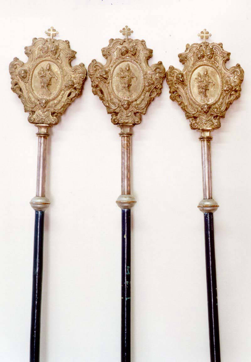 Descrizione: Insegna processionale in legno intagliato dorato e dipinto su asta argentata con pomo ovoidale modanato e dorato e tabella figurata dalla cornice a volute vegetali dipinta, da un lato di colore grigio con i Santi Cosma e Damiano nella tabella e oro e, dall'altro dorata con la Madonna del Carmine. Materiali e tecnica usati: legno intagliato, dipinto, dorato. L'autore proviene da bottega dell'Italia centrale. La datazione risale agli anni centrali del secolo XVIII (1740 - 1760) e misura cm 280.0x18.0 (HxL). Non si conosce l'esatta collocazione del bene ma risulta nell'inventario dei beni storici e artistici della Diocesi di Orvieto - Todi (TR).